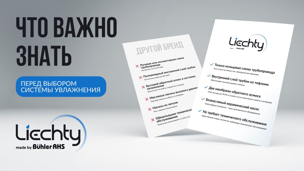 Бренд Liechty, созданный в результате технологической эволюции оборудования BuhlerAHS, предлагает обновленные системы увлажнения воздуха, сохраняя надежность, безопасность и внедряя современные стандарты качества и обслуживания.